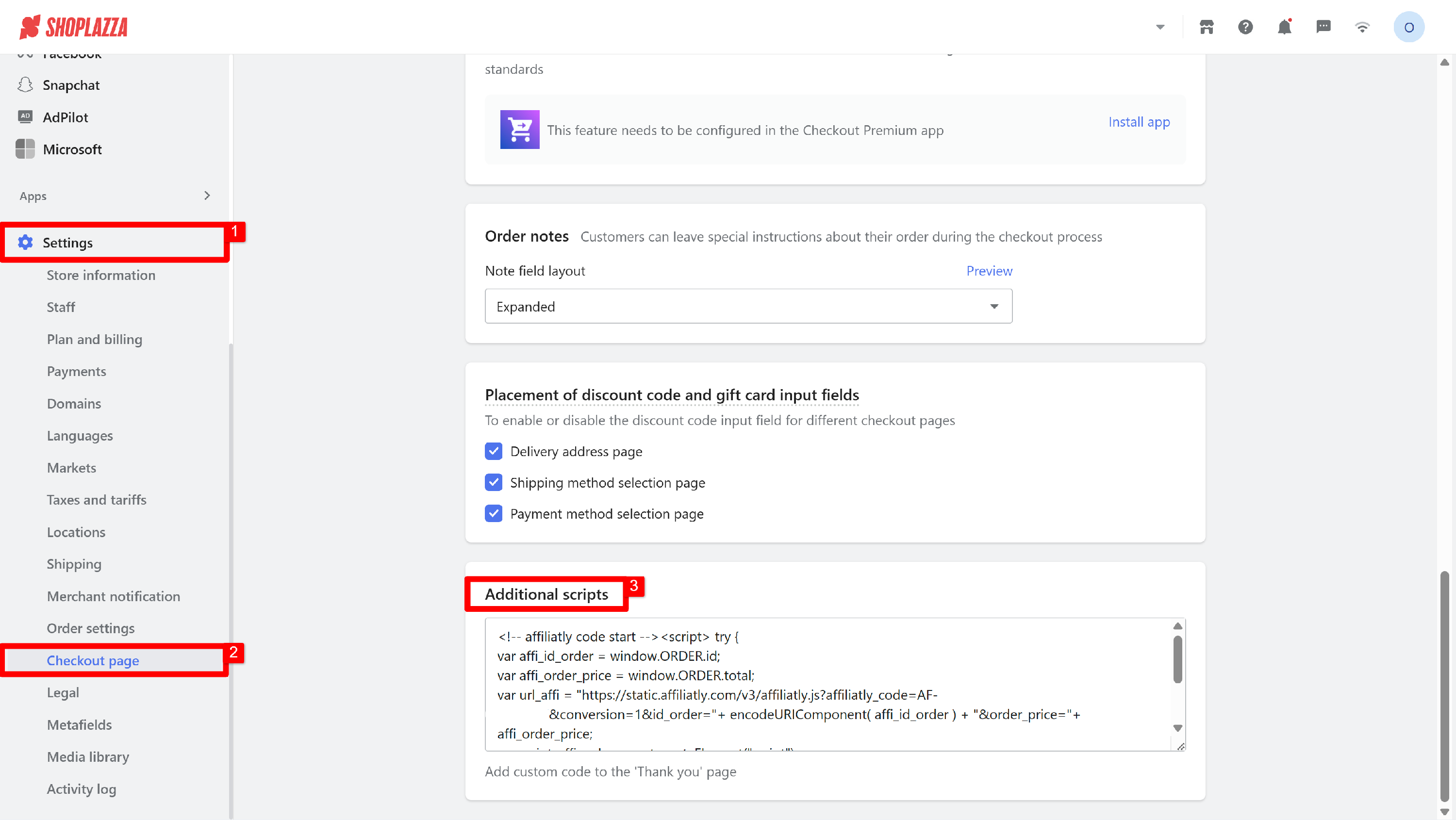 Once the app is installed, we will need to insert the code from the integration page on your Affiliatly account to your Shoplazza store's checkout page.